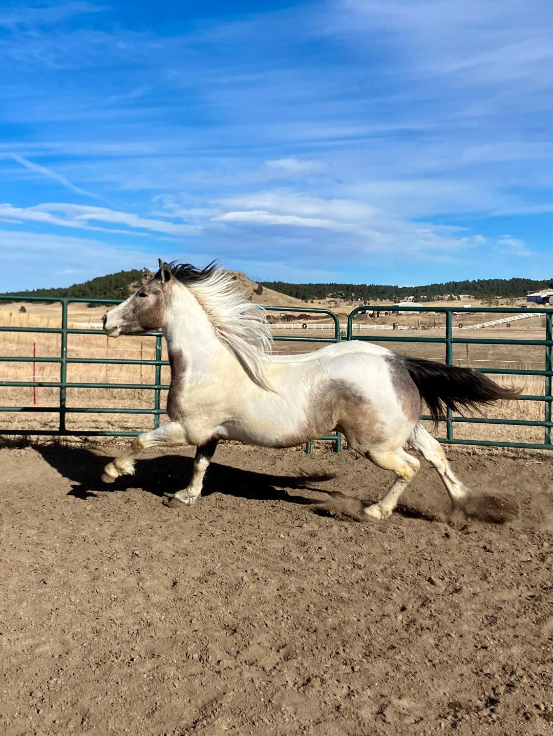 This Guyz A Royal is a 2022 APHA grey tobiano stallion. He brings versatility, bone and structure, athleticism, a spectacular mind, and color to the next generation.
